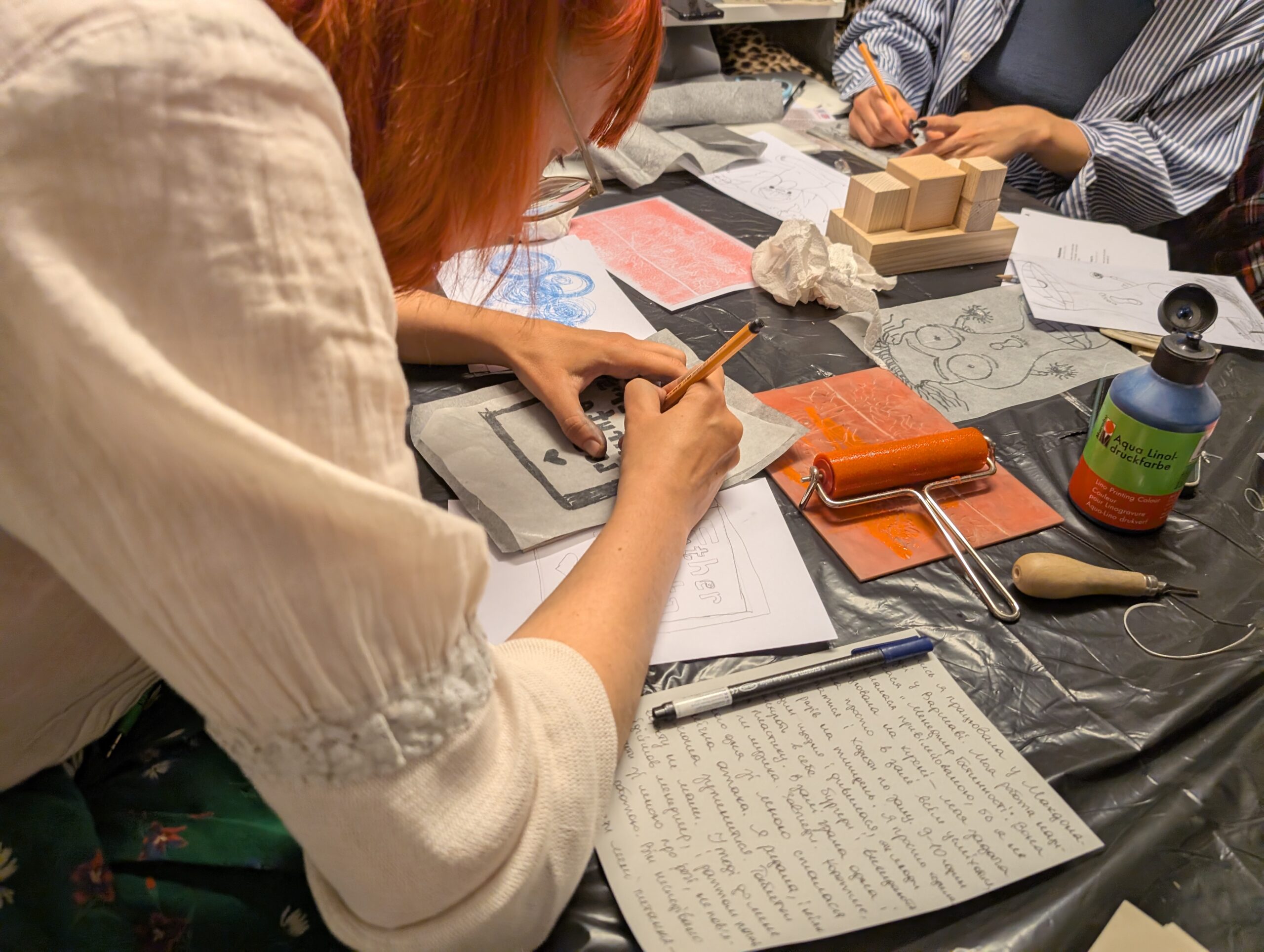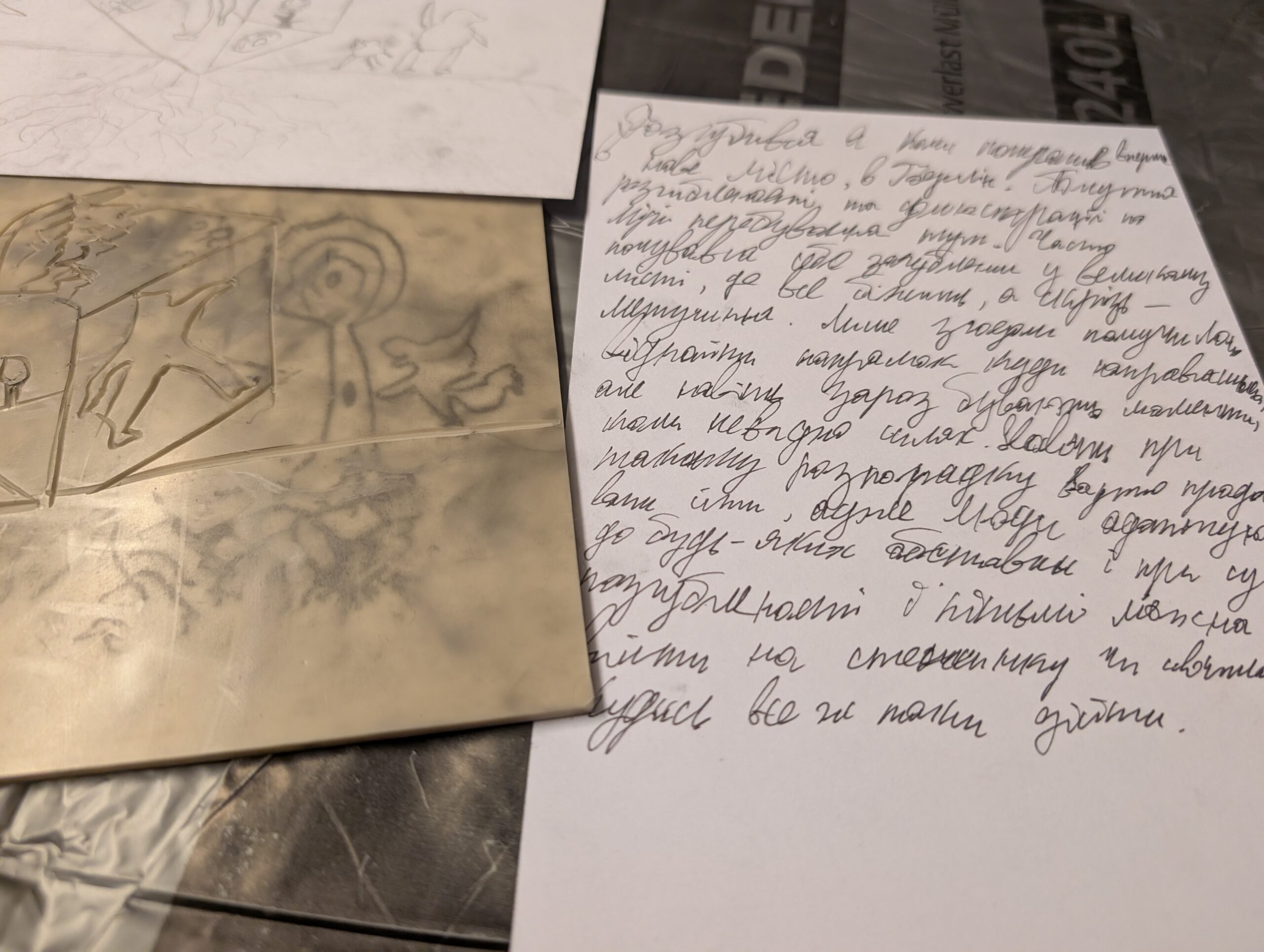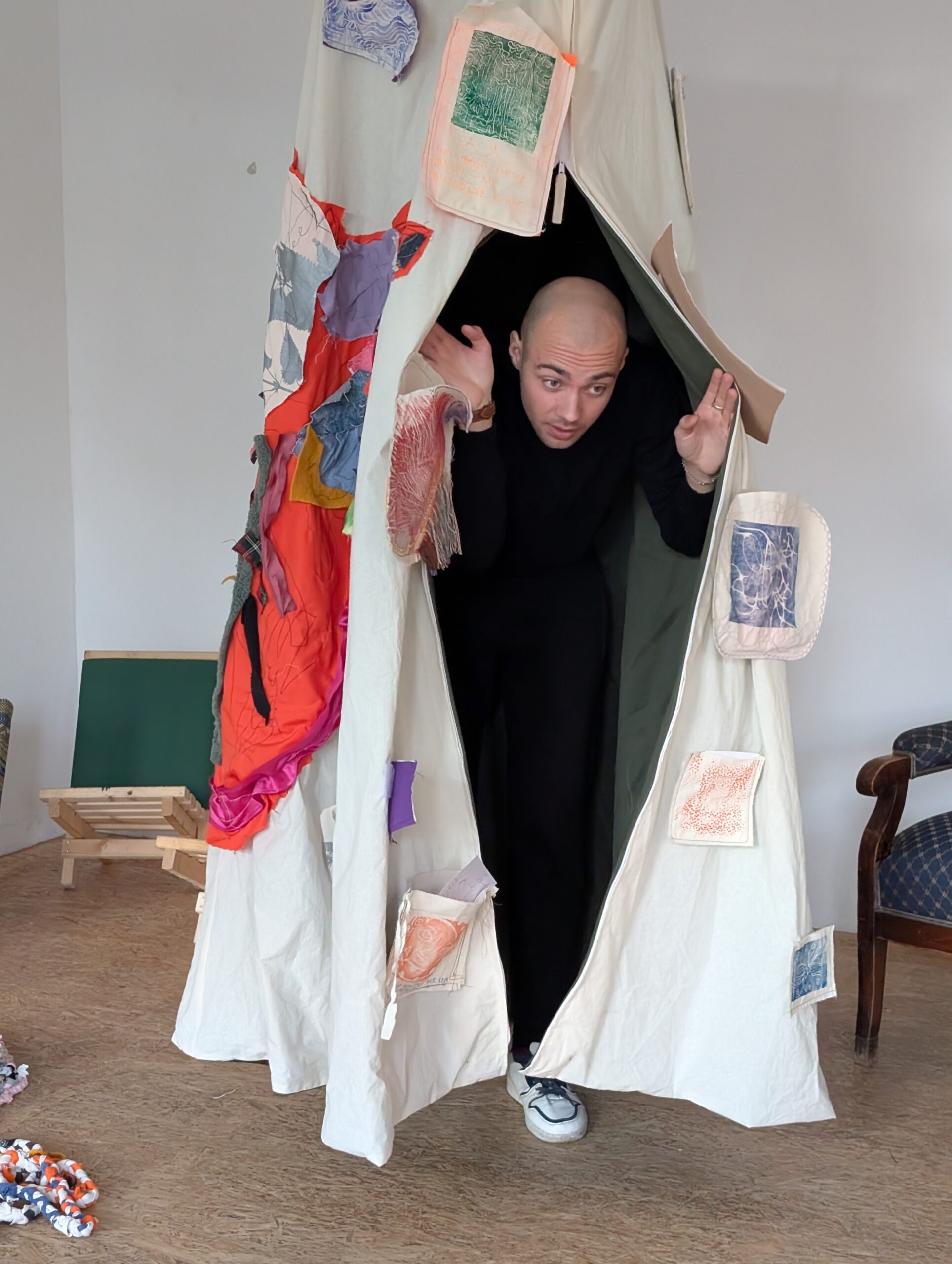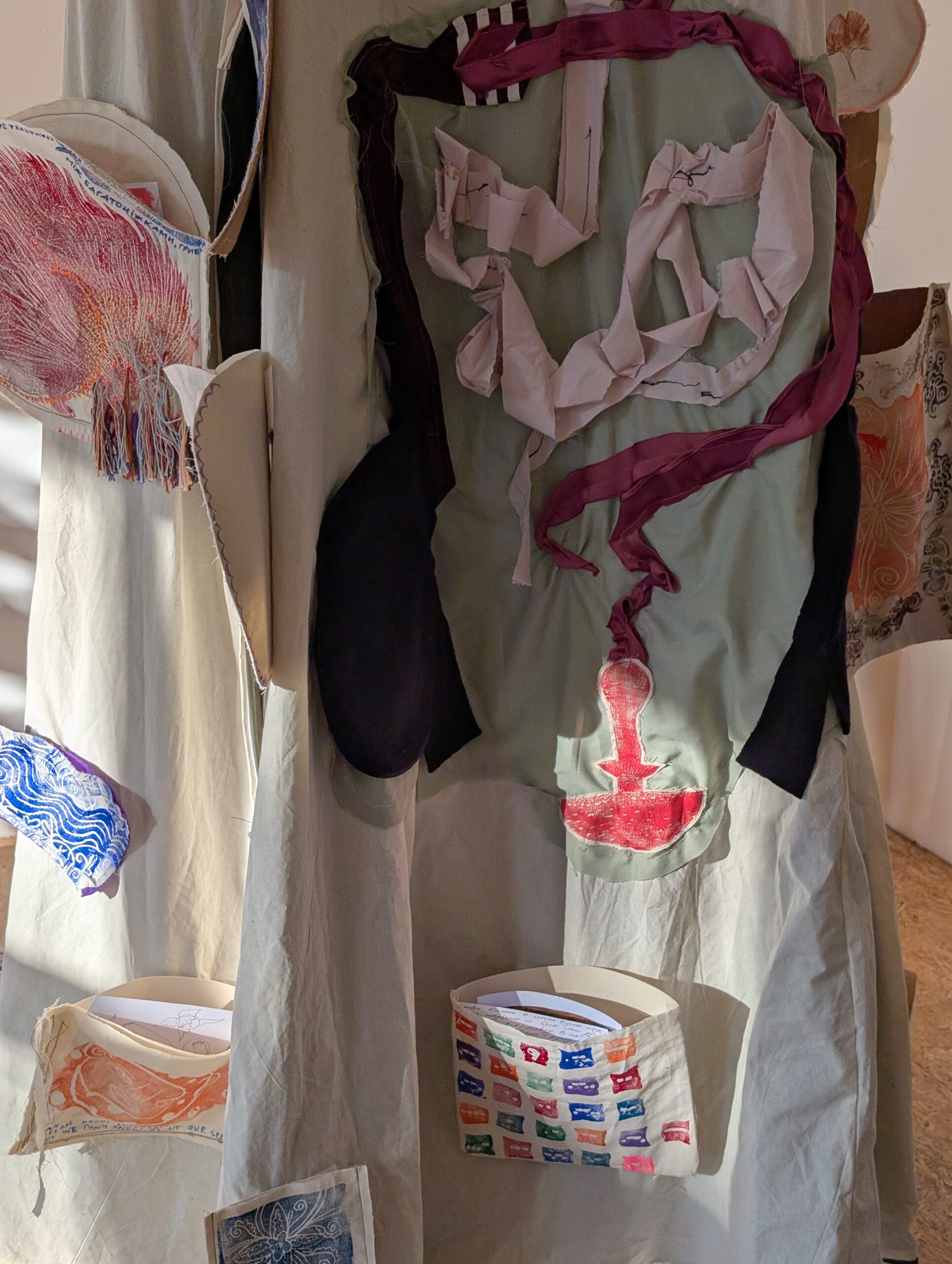Im Rumpf der Figur, der wie ein Rucksack getragen wird, befindet sich ein kleiner textiler Raum – eine aufhängbare „исповідальня“. Ein Ort zum kurzen Aussteigen, Atmen und Lauschen. Ein geschützter Raum, in dem man allein sein oder zu zweit sprechen kann.