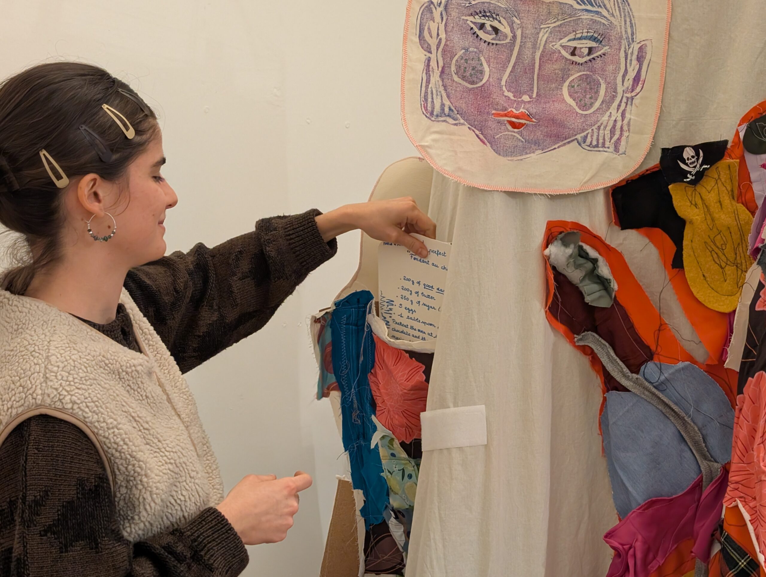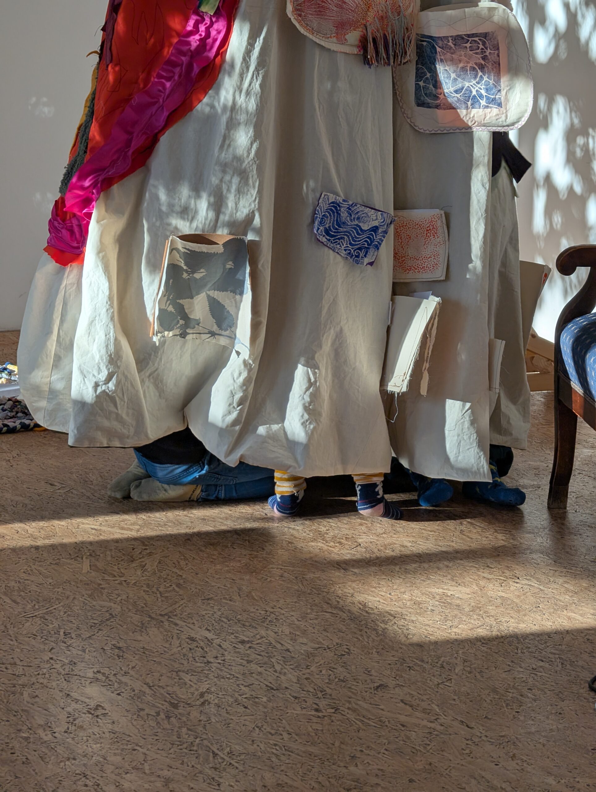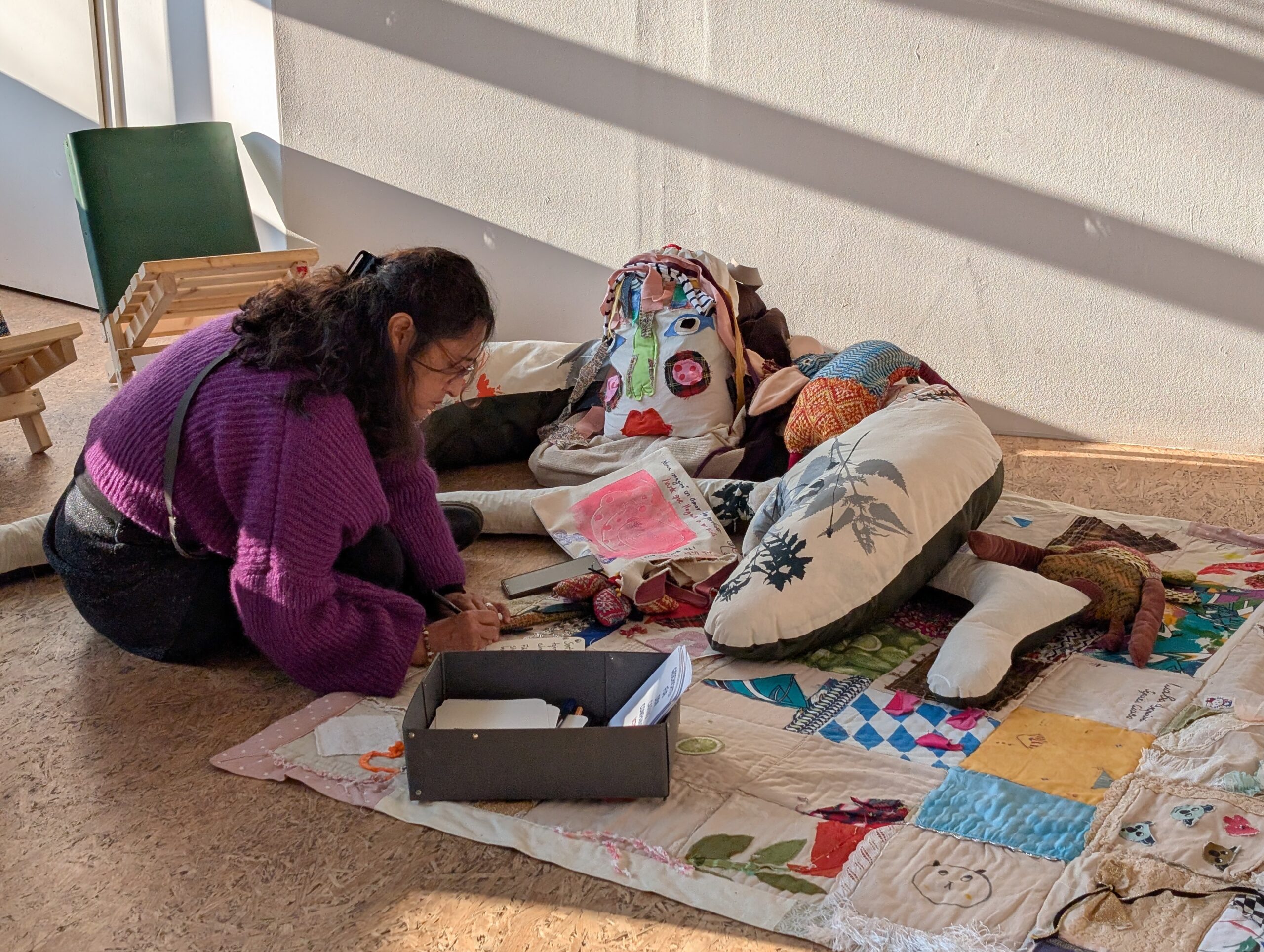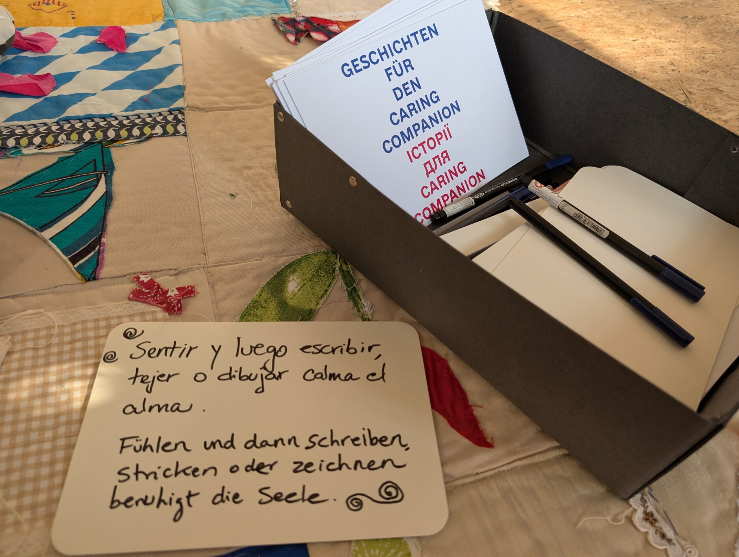 Der Companion sammelt Geschichten der Fürsorge. An der Außenseite des Raumes sind gemeinsam bedruckte und genähte Taschen angebracht, zusammen mit textilen Applikationen von Herz, Magen und Niere. Sie zeigen, wo diese Geschichten entstehen und wie sie im Körper wirken: vom Herzen ausgehend, in den Magen sinkend, bis tief in die Nieren spürbar.