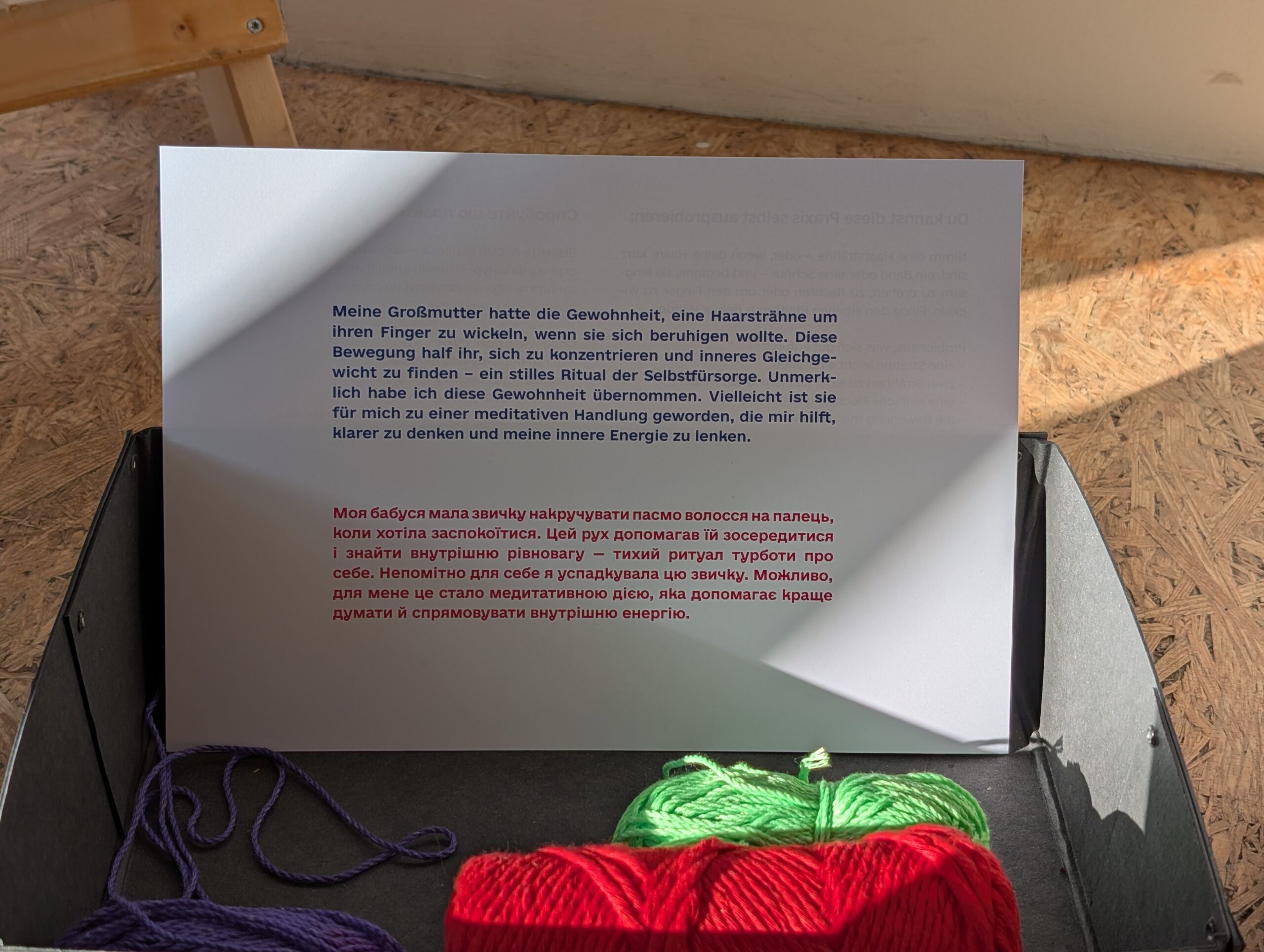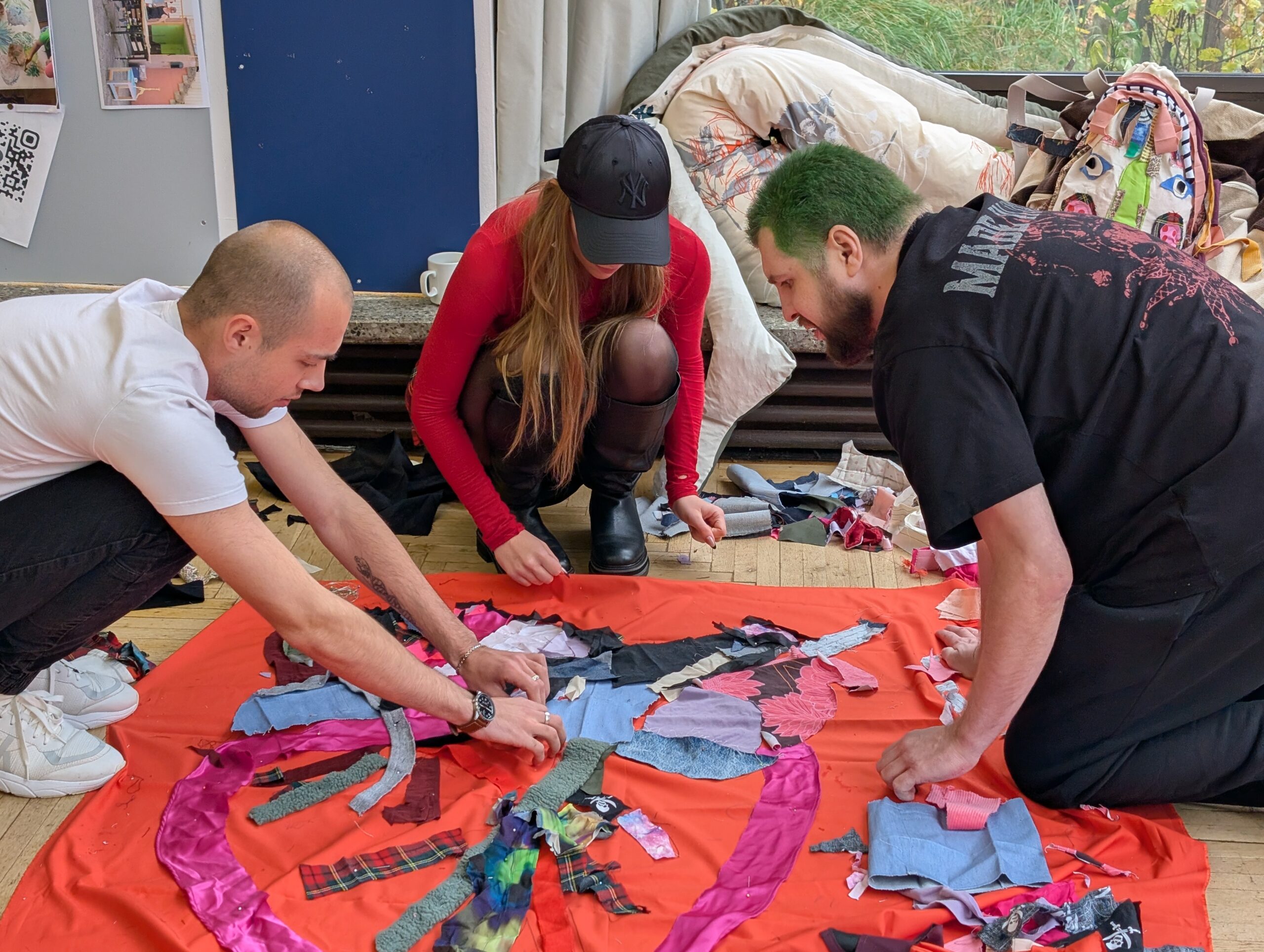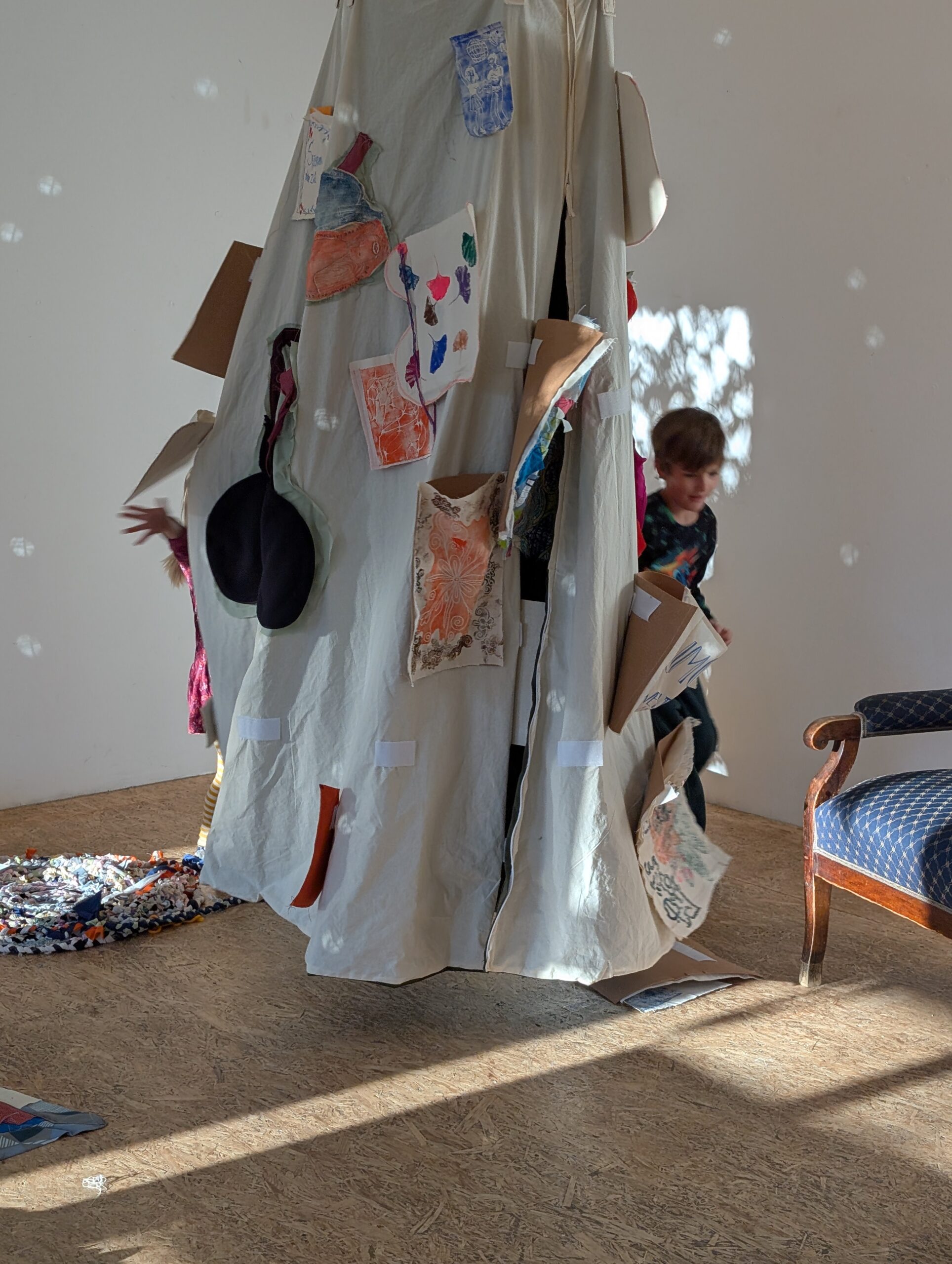 Der Companion sammelt Geschichten der Fürsorge. An der Außenseite des Raumes sind gemeinsam bedruckte und genähte Taschen angebracht, zusammen mit textilen Applikationen von Herz, Magen und Niere. Sie zeigen, wo diese Geschichten entstehen und wie sie im Körper wirken: vom Herzen ausgehend, in den Magen sinkend, bis tief in die Nieren spürbar.