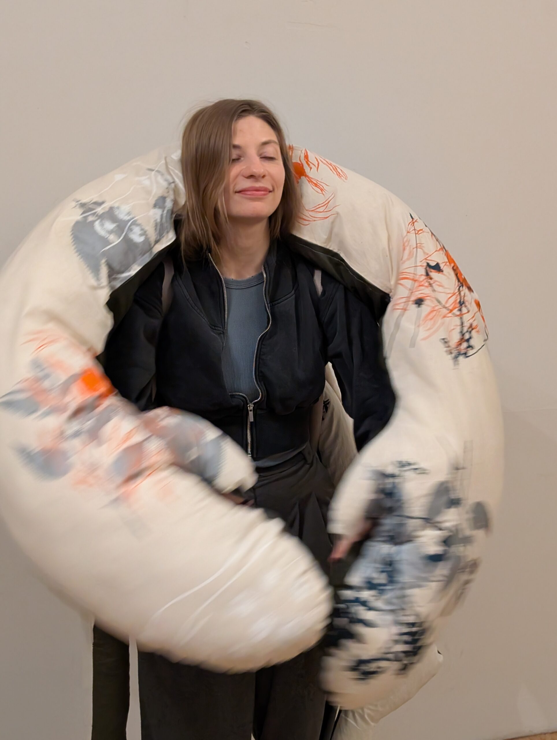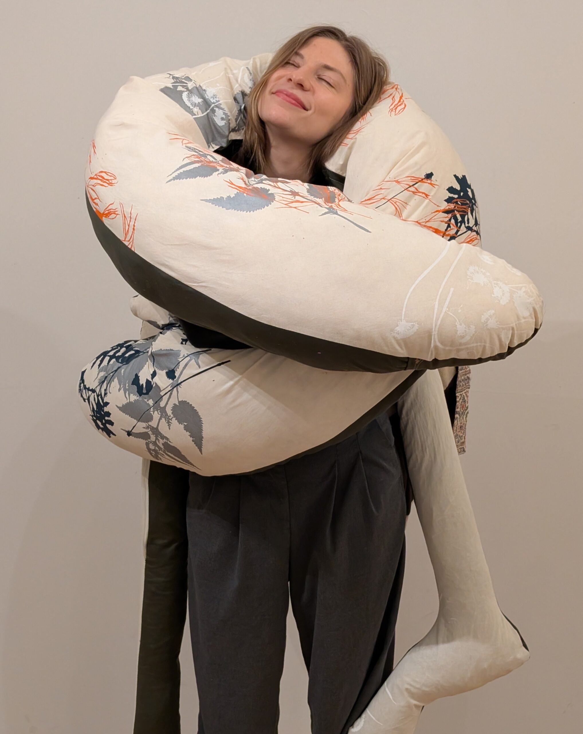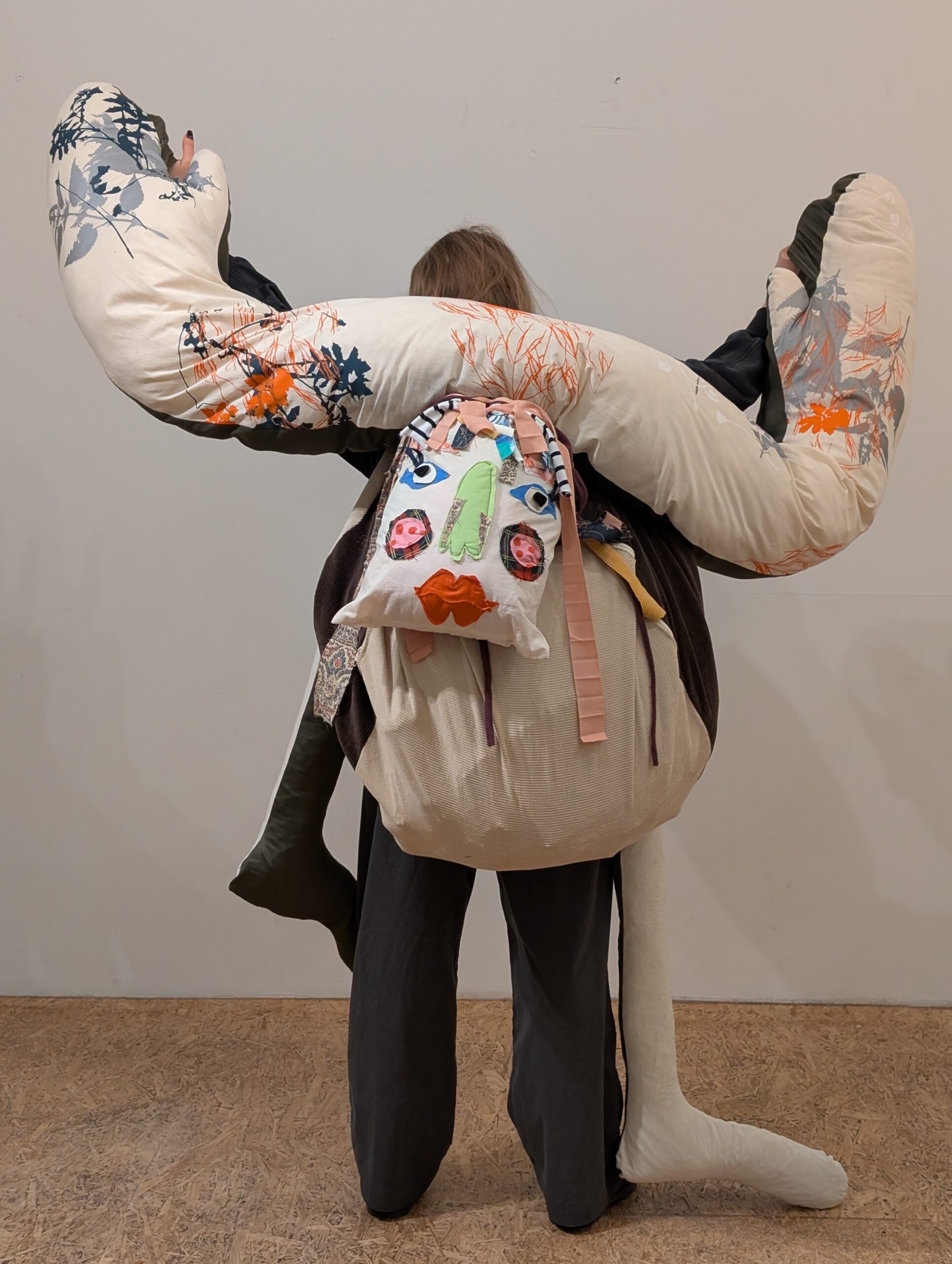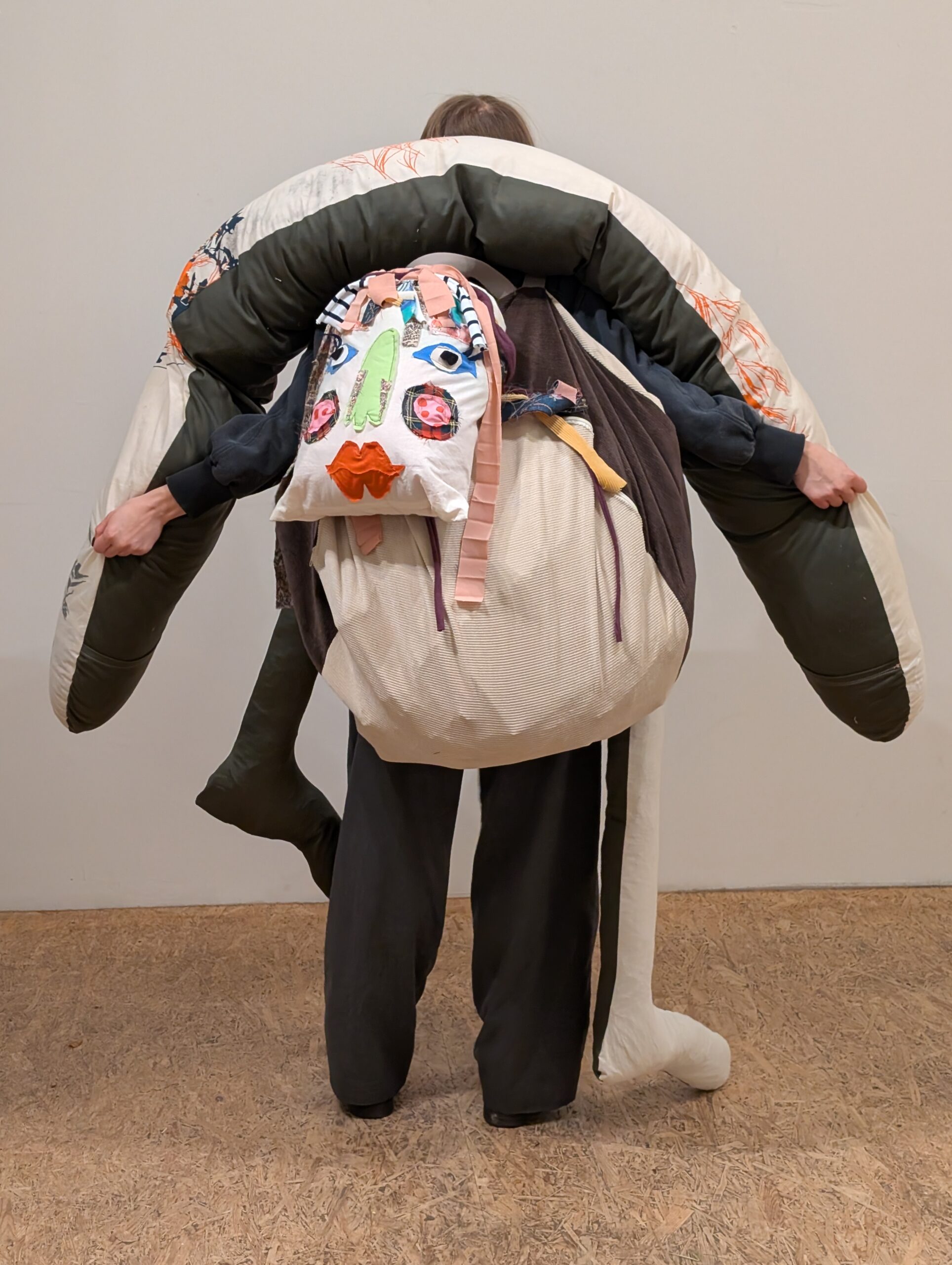 So wuchs die Vorstellung einer tragbaren textile Figur, die sich wie ein Gegenüber anfühlt: präsent, weich, ansprechbar.