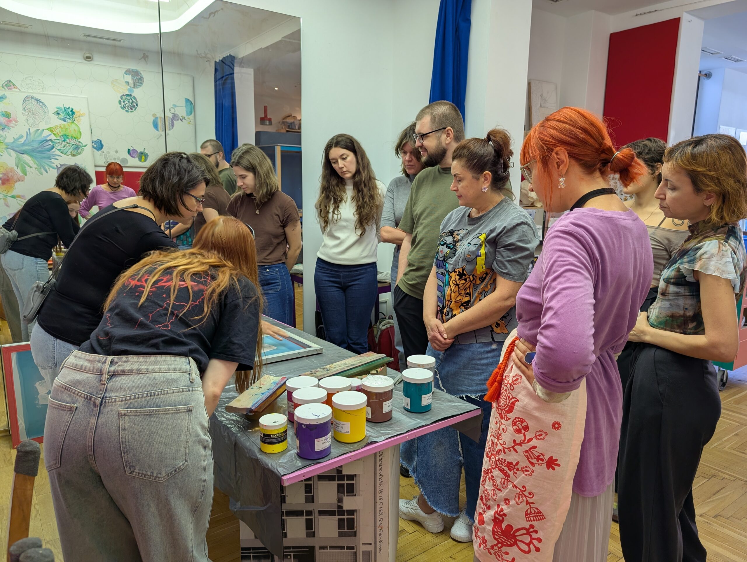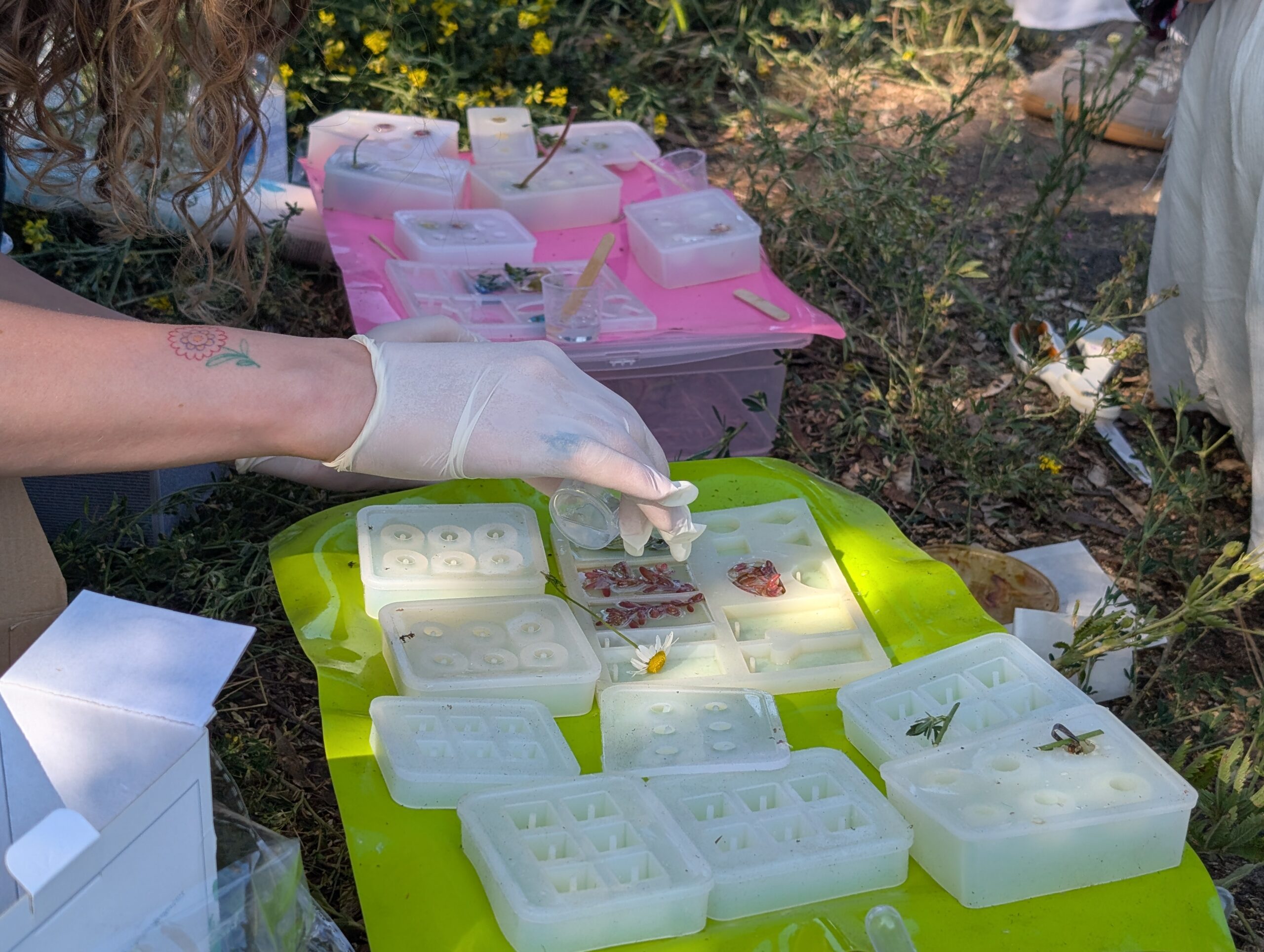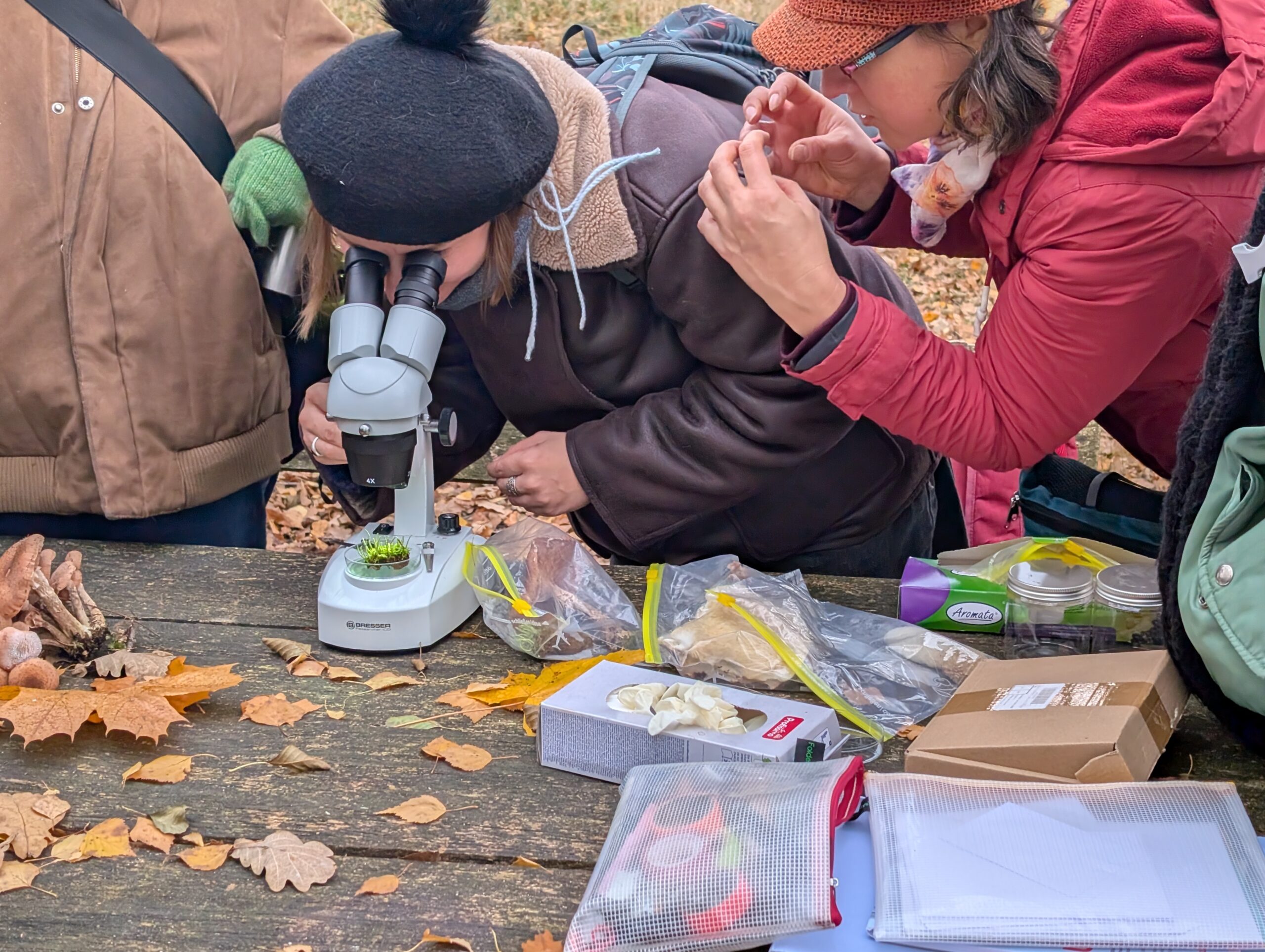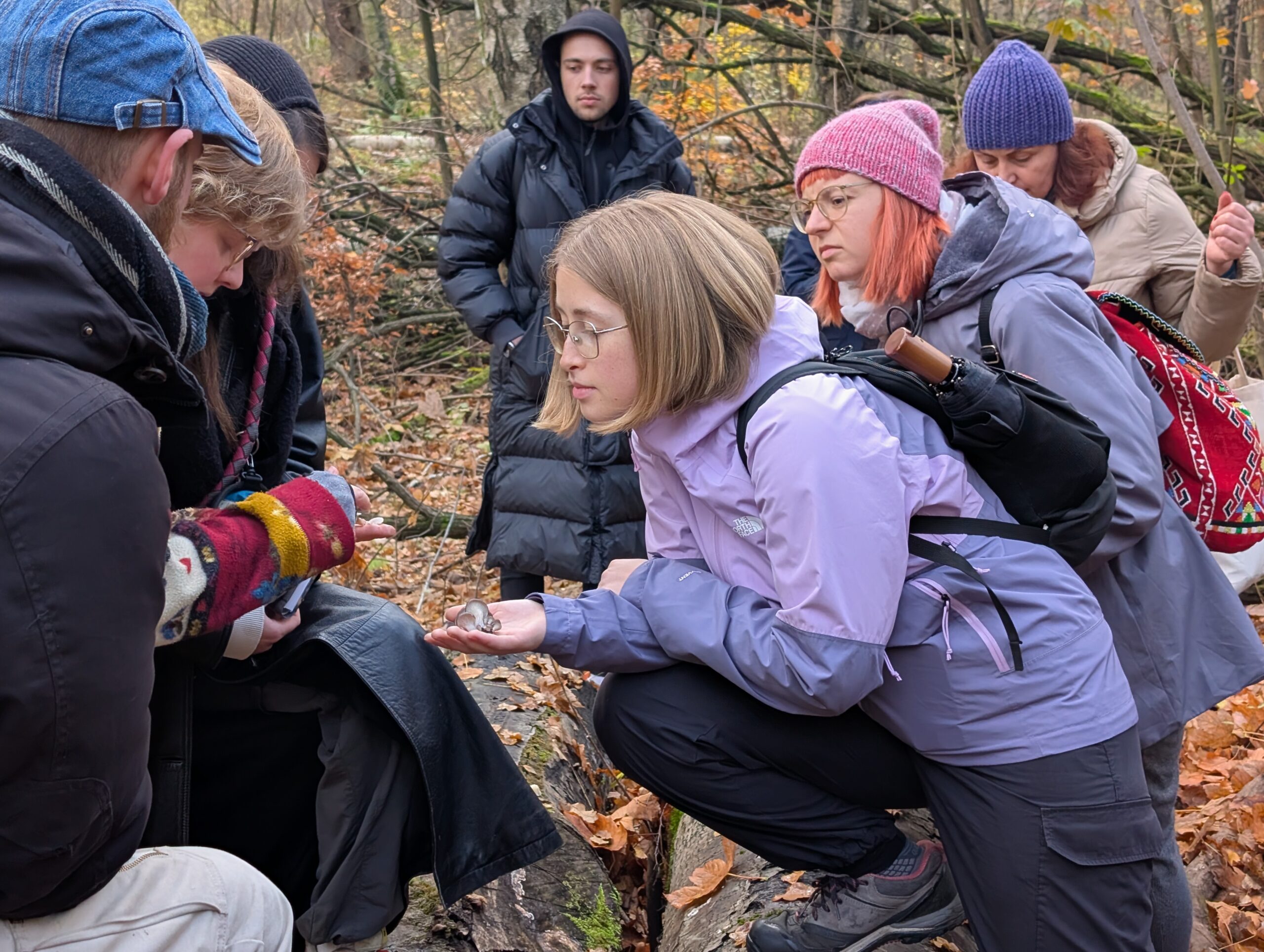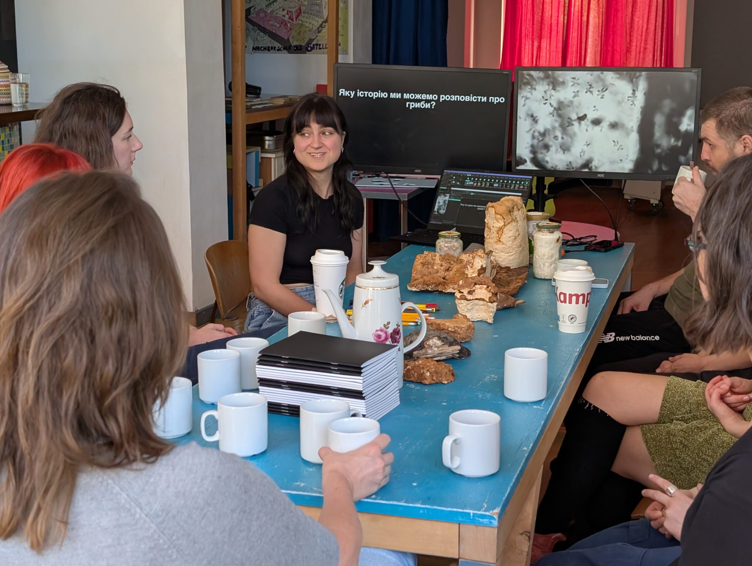 Über viele Monate hinweg traf sich die Gruppe regelmäßig, um diesen persönlichen Formen von Care gemeinsam nachzugehen. Die Treffen verbanden körperliche Übungen, Stimme, Atem und Resonanz mit Gesprächen über Alltag, Erinnerungen und Belastungen. Manche Begegnungen fanden draußen statt: Kräuter sammeln, Blumen flechten, Pilze suchen, beobachten, innehalten. Andere entstanden im Atelier – beim Drucken, Nähen, Zeichnen oder beim Teilen von Erfahrungen.