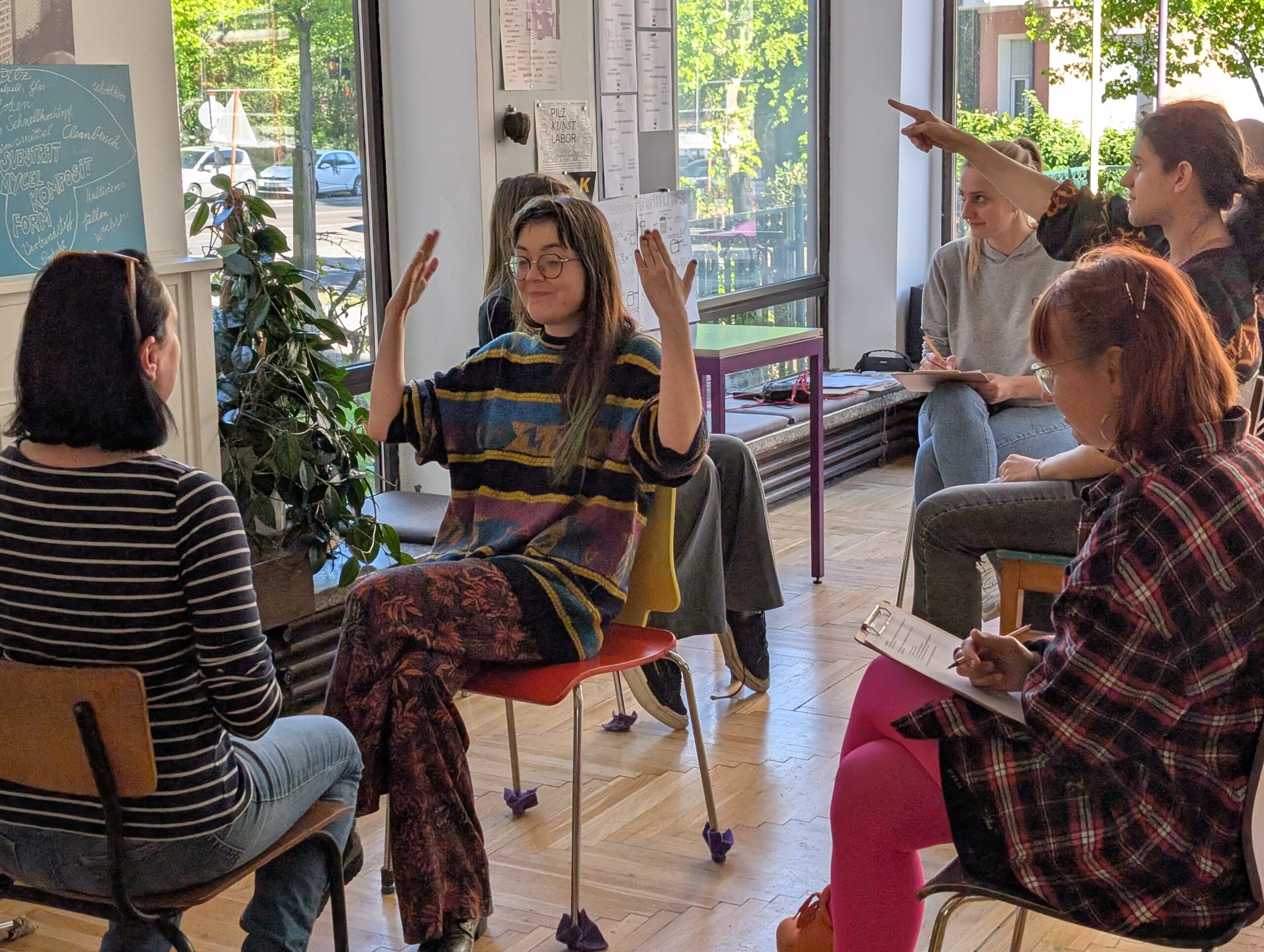 „Spaces of Care“ war ein offener Rahmen, in dem Menschen ausprobieren konnten, was ihnen Halt gibt, was sie beruhigt, was Nähe schafft und was Distanz ermöglicht. Dabei ging es um Wahrnehmung, um Vertrauen in sich und in die Gruppe, um das Erkunden von Emotionen und das Wiederfinden von Stimme, Rhythmus und Präsenz.